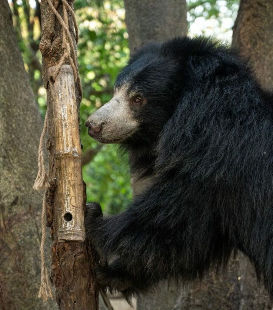 The veterinarians and caregivers at the Agra Bear Rescue Facility dedicated themselves to Bintha’s care, which helped her gradually recover from her mental and physical trauma. Bintha has grown up to be a healthy and active bear. While she enjoys playing with her enclosure mates, she likes to devote time to indulge in solo pursuits as well. She uses her claws and paws with dexterity to dig pits in her enclosure, and gets excited to explore every new enrichment that her caregivers install.