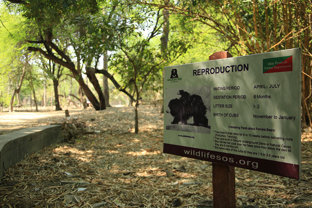 The Agra Bear Rescue Facility is the largest sloth bear rescue facility in the world. Established in 1999 by Wildlife SOS in collaboration with the Uttar Pradesh Forest Department, it currently houses 89 sloth bears as well as many other species of wildlife in large forested enclosures with ponds and shady trees. The facility undertakes advanced research, disease management and provides specialised veterinary as well as geriatric care for sloth bears.